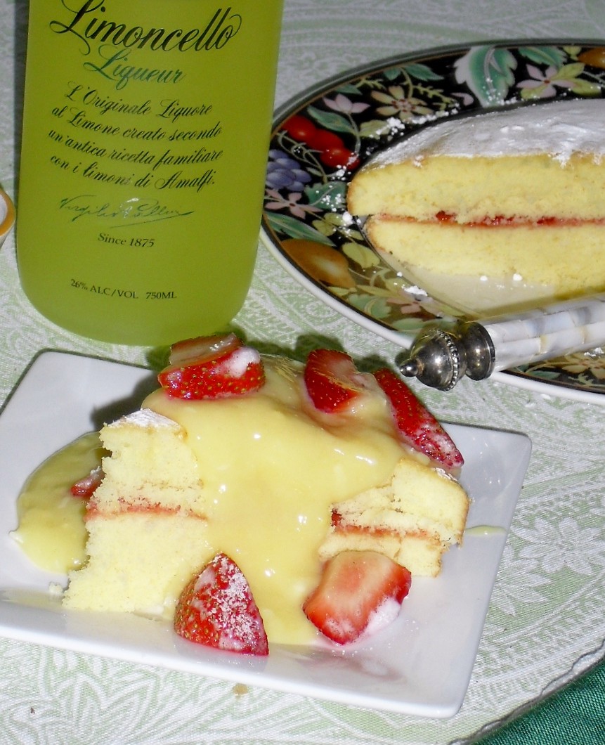 I MAKE A LIMONCELLO STRAWBERRY JAM CAKE for dinner, an easy dessert and one of my family’s favorites. My Mother made hundreds of jelly rolls for us when we were growing up – and we loved them for dinner, snacks and breakfast. This is an adapted version of her jelly roll that I can put together faster when time is limited. Today I used a yellow cake mix. I followed the box directions, but substituted 1/4 cup limoncello liquour for part of the required liquid and orange juice for the rest, and added 1/4 cup sour cream. I made two layers, put them together with strawberry jam and dusted the top with powdered sugar. This is good to eat as is, but today, I added a dollop of lemon curd (from a jar) mixed with 1 tsp of limoncello and topped with strawberries.