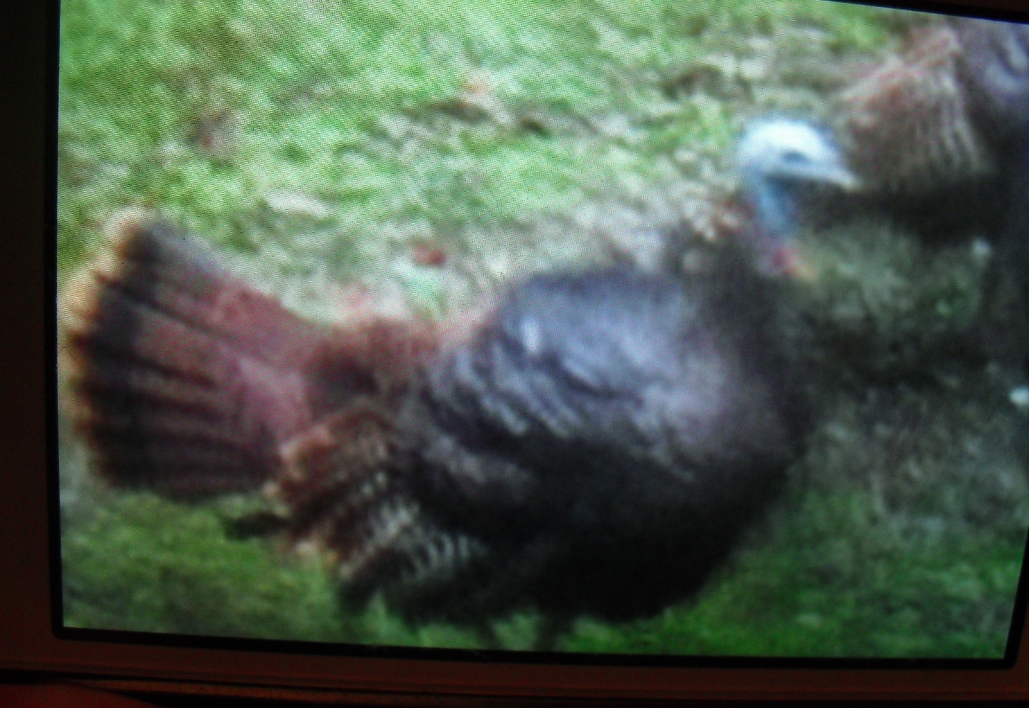 THE WILD TURKEYS are marching again. I edged too close taking this picture in the yard. A second after it was taken, the tom turkey jumped on the hood of the car, fluffed out his feathers and screeched in such an unexpected and aggressive display, that I jumped back in fright.