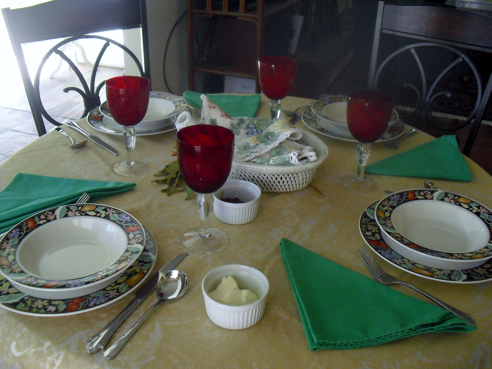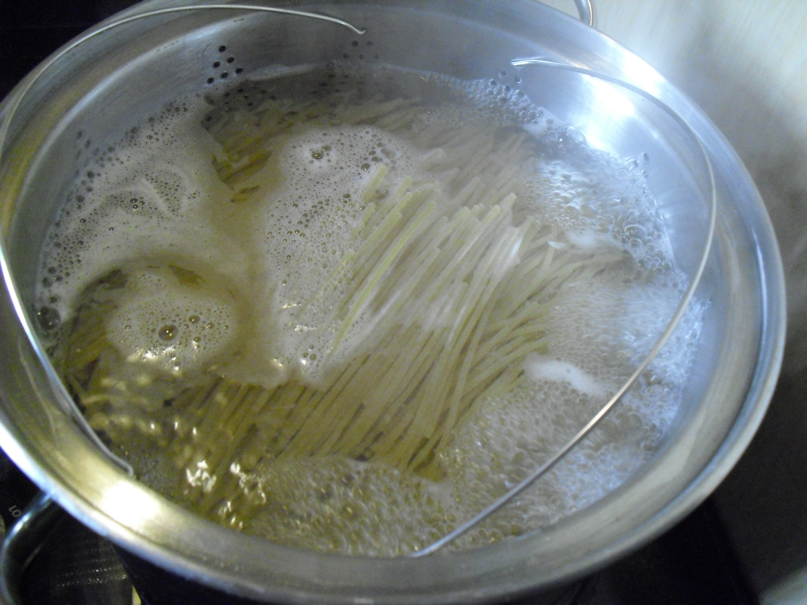I WATCHED THE PASTA carefully to not overcook and drained it and moved it to the back of the stove for the last few minutes for the sauce to thicken. I set the table and put the garlic bread in the oven to heat. Tossed the salad with a little extra virgin olive oil and balsamic vinegar.